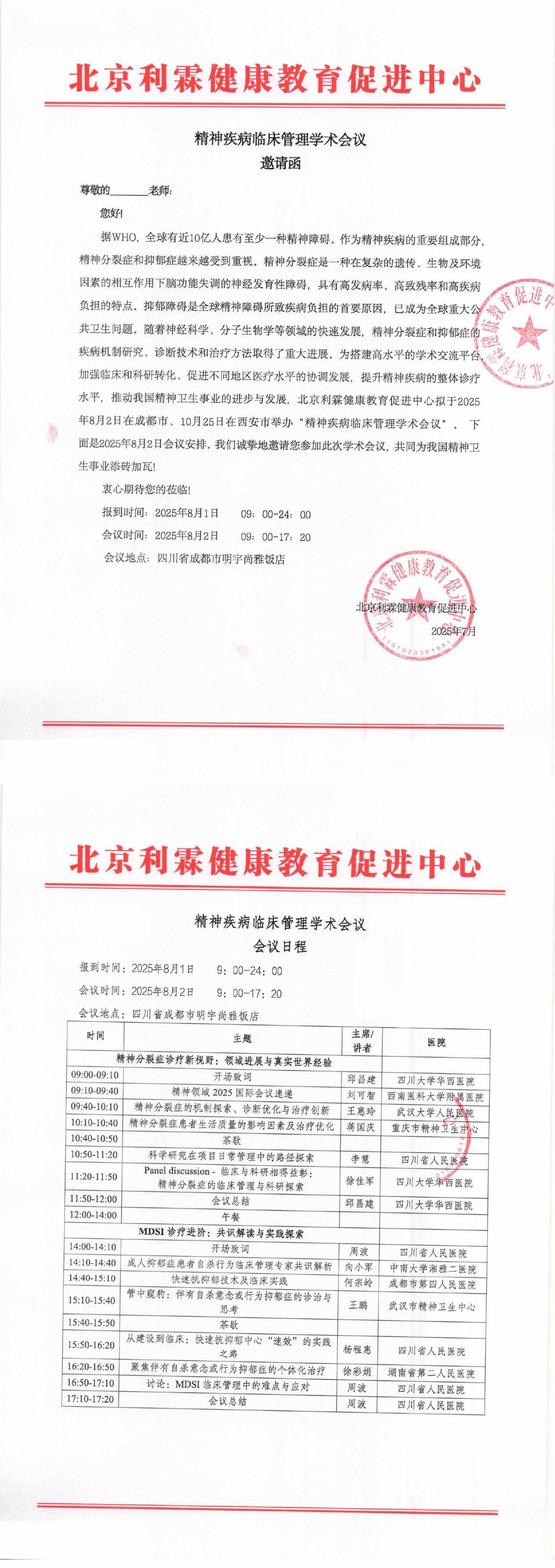 精神疾病临床管理学术会议-邀请函(8月2日成都会议更新日程)